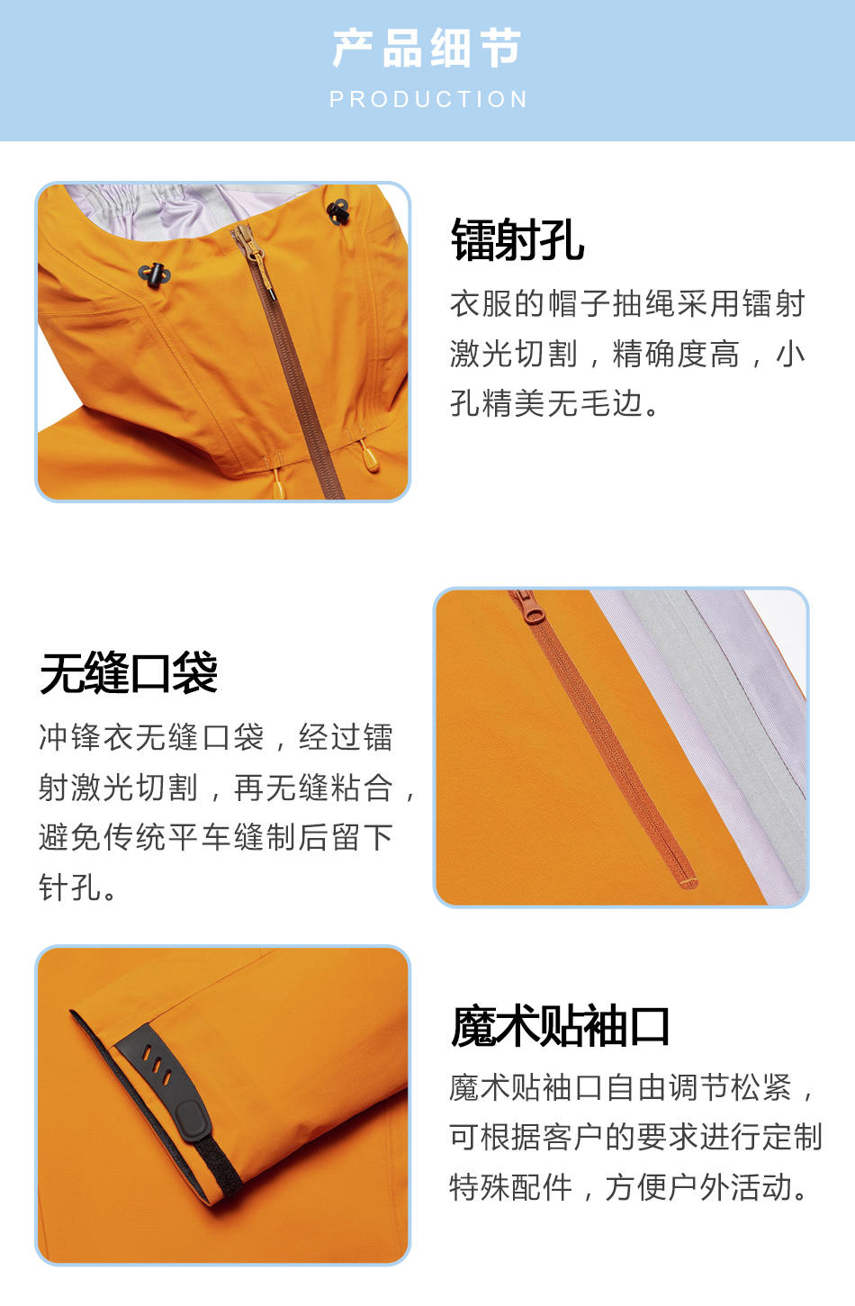 無(wú)縫口袋:沖鋒衣無(wú)縫口袋,經(jīng)過(guò)鐳射激光切割,再無(wú)縫粘合,避免傳統(tǒng)平車(chē)縫制后留下針孔。