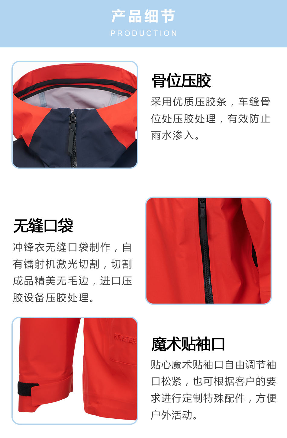 • 無縫口袋單層沖鋒衣代工采用無縫口袋制作,自有鐳射機激光切割,切割成品精美無毛邊,進口壓膠設備壓膠處理。
