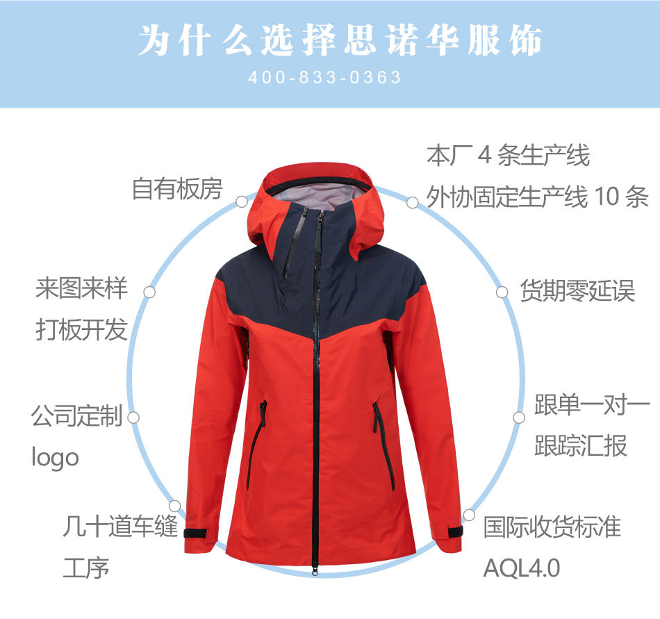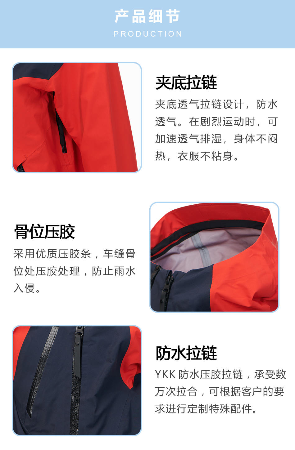 • 防水拉鏈單層沖鋒衣生產使用YKK防水壓膠拉鏈,承受數萬次拉合,可根據客戶的要求進行定制特殊配件。
