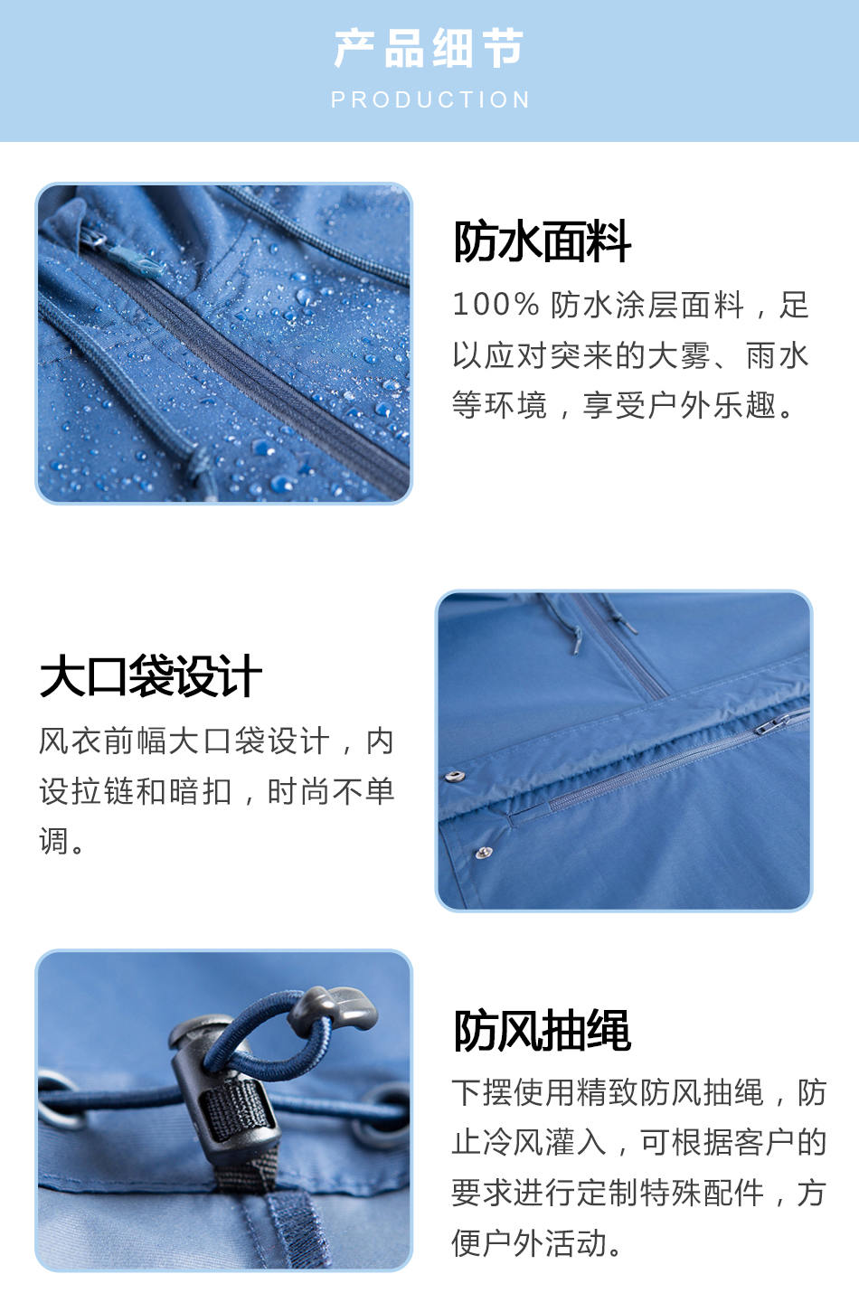 防風抽繩:下擺使用精致防風抽繩,防止冷風灌入,可根據(jù)客戶的要求進行定制特殊配件,方便戶外活動。