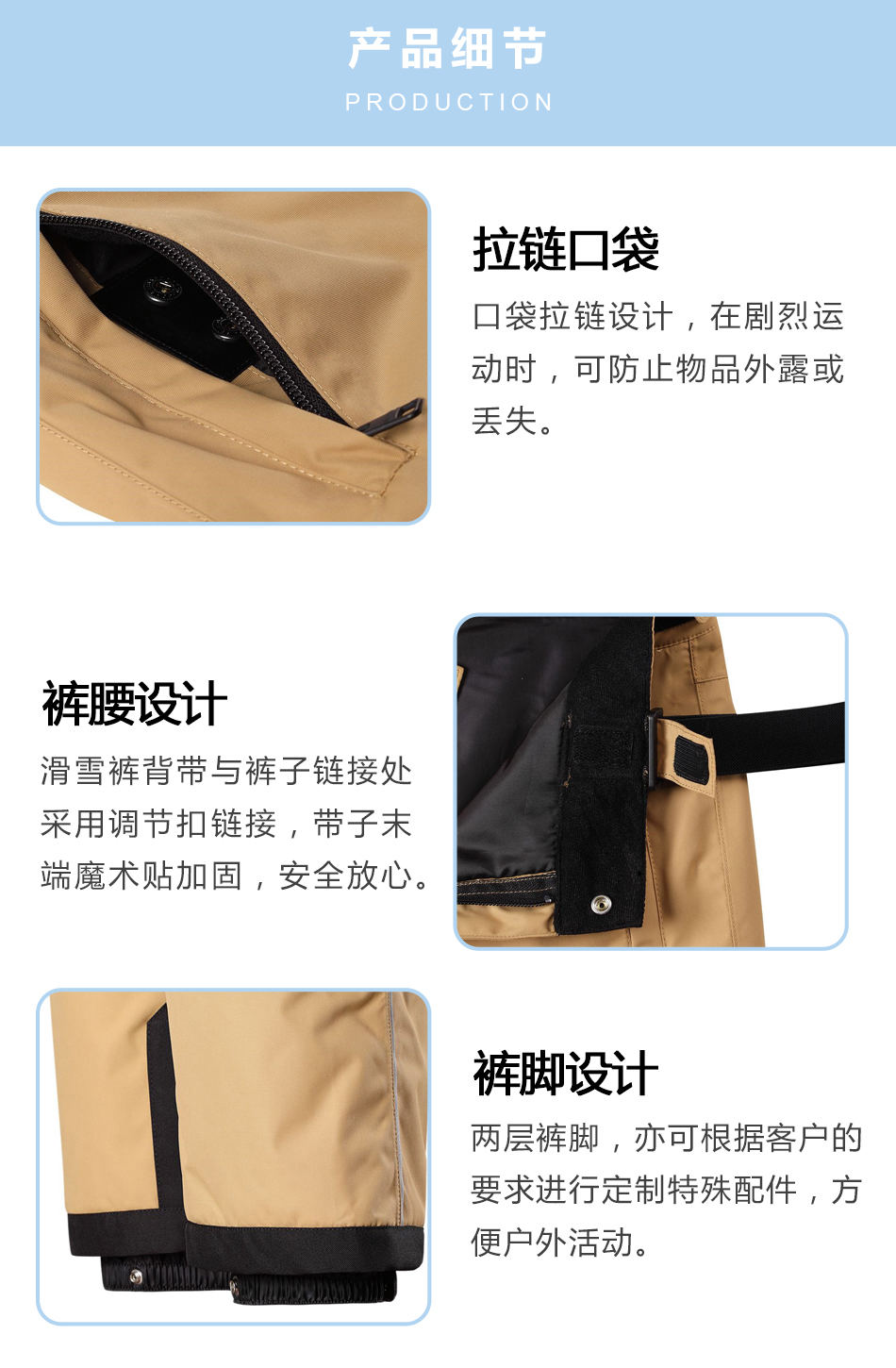 褲腰設(shè)計(jì)戶外滑雪褲加工的背帶與褲子鏈接處采用調(diào)節(jié)扣鏈接,帶子末端魔術(shù)貼加固,安全放心。