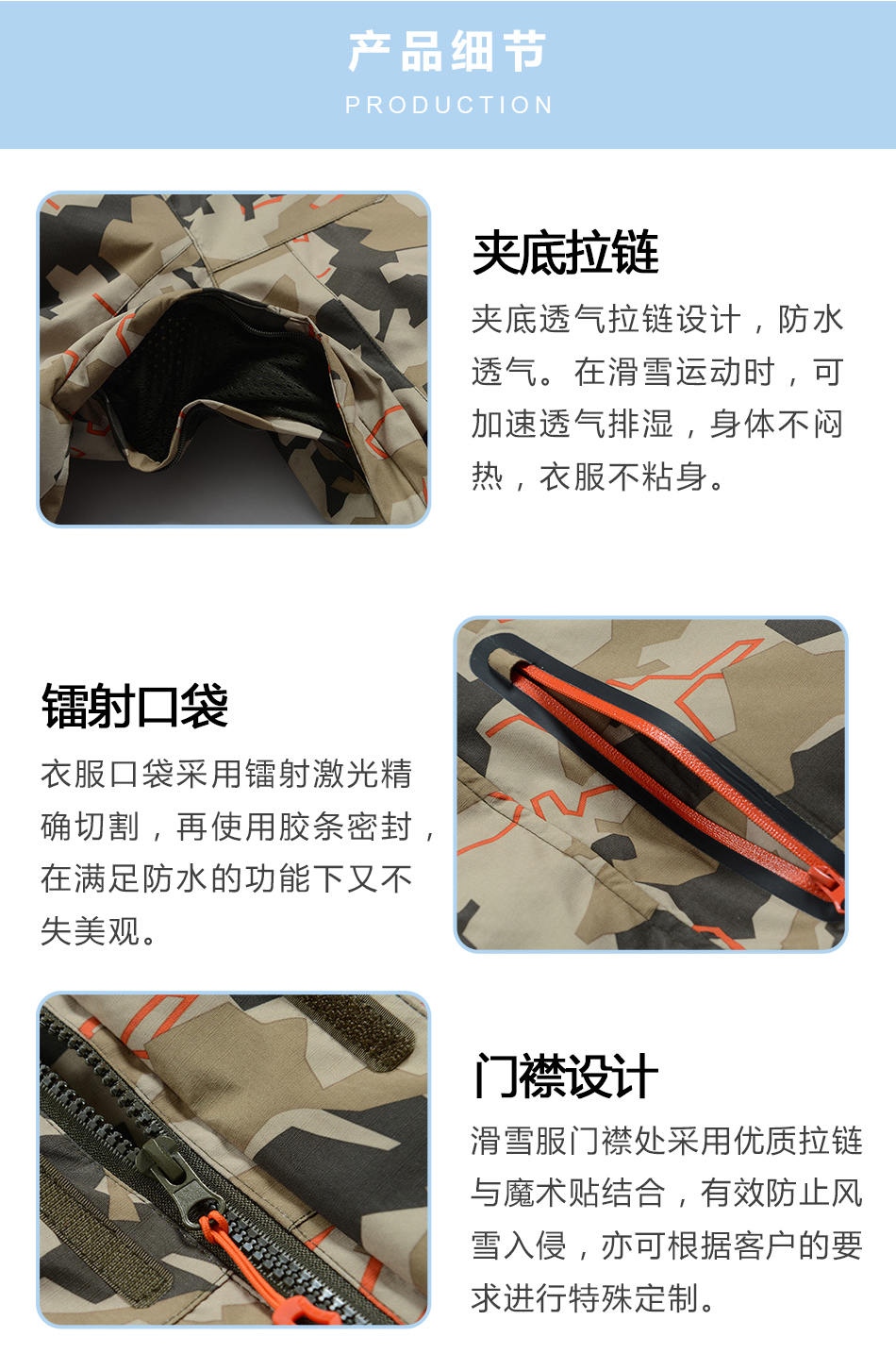 • 門襟設計:滑雪服門襟處采用優質拉鏈與魔術貼結合,有效防止風雪入侵,亦可根據客戶的要求進行特殊保暖滑雪服加工