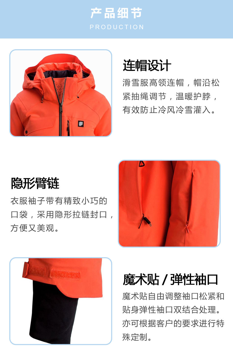 連帽設(shè)計(jì):滑雪服高領(lǐng)連帽,帽沿松緊抽繩調(diào)節(jié),溫暖護(hù)脖,有效防止冷風(fēng)冷雪灌入。